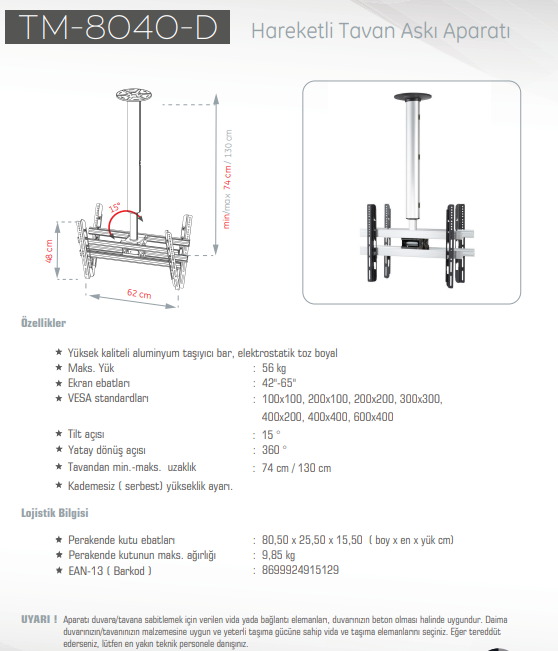 Ultimate TM-8040-D TV Tavan Askı Aparatı 56 Kg